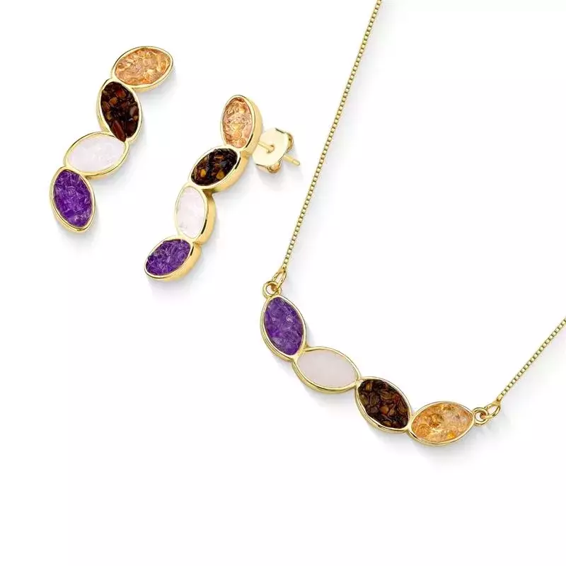 Conjunto de brinco e colar banhado a ouro 18k com pedras naturais de Ametista, Selenita, Olho de Tigre e Citrino — uma combinação poderosa de proteção, clareza e prosperidade. A Ametista eleva a espiritualidade e acalma a mente; a Selenita purifica o campo energético e traz paz interior; o Olho de Tigre fortalece a coragem e a autoconfiança; e o Citrino ativa a abundância, a alegria e o poder pessoal. Um acessório elegante e vibrante, para quem deseja alinhar beleza com força interior e energia positiva.